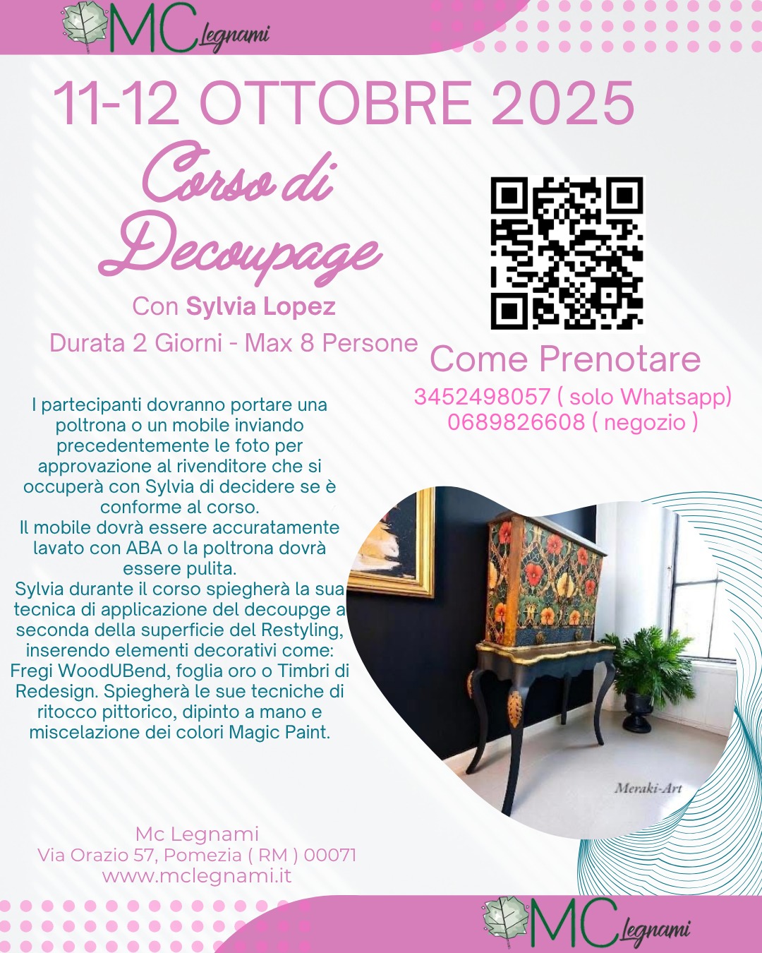 mcI partecipanti dovranno portare una poltrona o un mobile inviando precedentemente le foto per approvazione al rivenditore che si occuperà con Sylvia di decidere se è conforme al corso. Il mobile dovrà essere accuratamente lavato con ABA o la poltrona dovrà essere pulita. Sylvia durante il corso spiegherà la sua tecnica di applicazione del decoupge […]